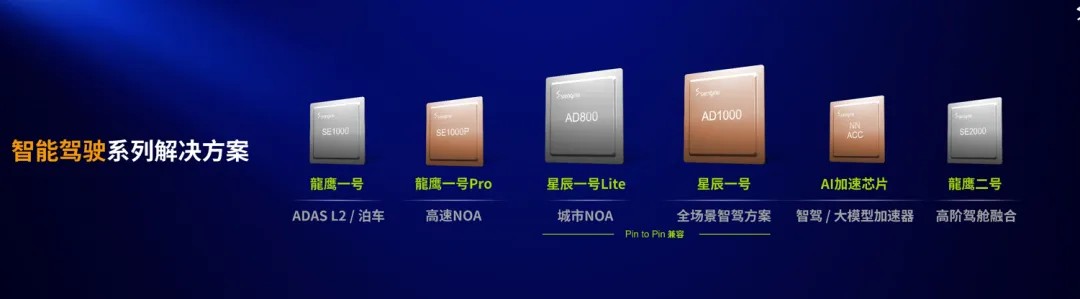 在智能駕駛系列解決方案中,芯擎推出6款芯片方案,能夠覆蓋從L2級別智駕、高速NOA、城市NOA、全場景智駕到高階艙駕融合的全部需求。可在最短的時間內,為車輛提供主動安全、高速NOA、城市NOA以及端到端智駕大模型的功能