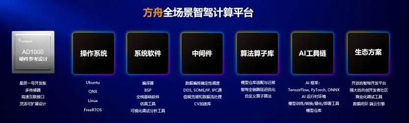 基于“星辰一號”7nm車規芯片,芯擎科技搭建了開放的全場景生態平臺:芯擎方舟,分別從芯片基礎能力,操作系統、系統軟件、中間件、算法算子庫、AI工具鏈,生態方案等方面開放賦能,為客戶提供一站式的算法開發和端到端的大模型部署,同時具備數據流調優,規劃控制整車適配,以及數據閉環端云結合的能力。