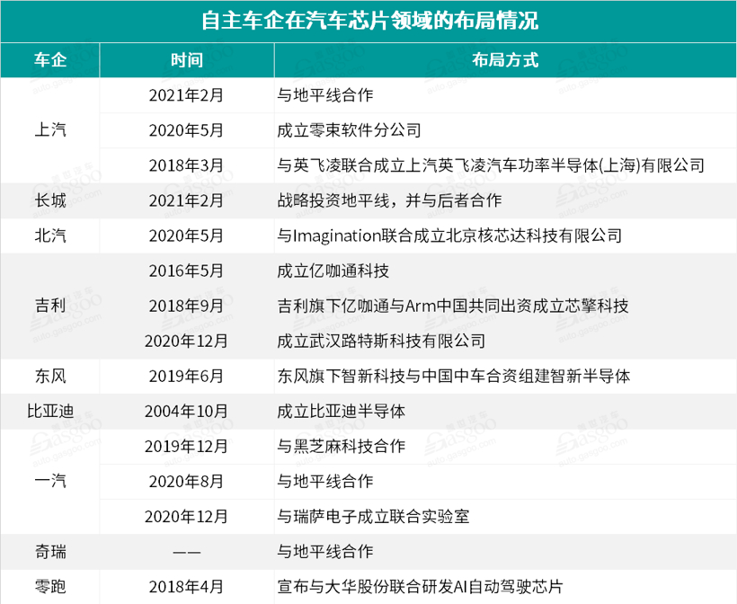 在吉利入局之后,上汽、東風、一汽、北汽、長城等車企,也相繼開始有所動作。比如上汽于2018年3月與英飛凌聯合成立上汽英飛凌汽車功率半導體(上海)有限公司,迎戰電氣化。2020年5月,為順應“軟件定義汽車”變革趨勢,上汽又成立了零束軟件分公司,進行算力芯片、SOA軟件平臺等的自主研發,以補齊在智能駕駛芯片領域的短板。并于近日宣布牽手地平線,共同打造對標特斯拉FSD的下一代自動駕駛域控制器。上汽在芯片領域的產業布局因此接近完成閉環。